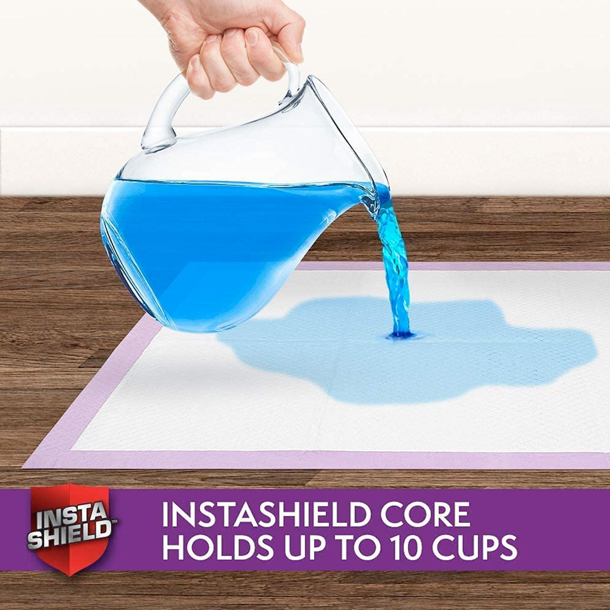 For multi-dog homes and pets that need to stay inside for extended periods, we have an All Day pee pad solution. Simple Solution All Day Premium Dog Pads with InstaShield™ Technology contain up to 10 cups of liquid and help eliminate unpleasant odors. The tear resistant top sheet and diamond quilting prevent puddling and tracking while 6-layers of guaranteed leak-proof protection keeps the mess off your floors. A lavender scent only adds to the pleasant change these pads will bring to your home. 6-LAYERS OF PROTECTION – Simple Solution puppy training pads contain messes and keep your floors clean with 6-layers of guaranteed leak-proof protection. ABSORB MORE LIQUID – Super absorbent InstaShield Technology allows these dog pads to hold up to 10 cups of liquid for all day protection. NO TEARS, NO TRACKING – The tear-resistant top sheet of our pee pads for dogs features diamond quilting to prevent puddling and tracking by quickly pulling moisture into the absorbent core. LAVENDER SCENT – Simple Solution All Day puppy pads have an odor neutralizing core, complemented by a fresh lavender scent to keep your home smelling fresh all day. ALL DAY PROTECTION – Our 23 x 24 inch dog pads are a great solution for multi-dog homes and pets that need to stay inside for extended periods of time.
