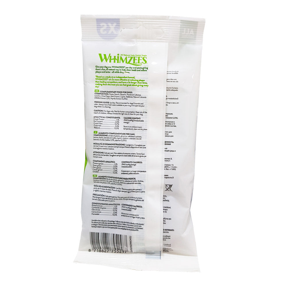 Now your dog will always want to brush their teeth. Made with all-natural ingredients, the vegetable-based texture will help remove plaque and tartar as they chew. NATURAL · GLUTEN-FREE · VEGETARIAN NATURAL INGREDIENTS: POTATO STARCH, GLYCERIN, POWDERED CELLULOSE, LECITHIN, YEAST, MALT EXTRACT, SWEET LUPINE MEAL, ANNATTO EXTRACT COLOR, ALFALFA EXTRACT GUARANTEED ANALYSIS Crude Protein (min) - 1.1% Crude Fat (min) - 2.3% Crude Fat (max) - 4.0% Crude Fiber (max) - 13.7% Moisture (max) - 12.0% FEEDING GUIDELINES We recommend one properly sized treat per day. Not suitable for dogs under the age of 9 months. Not suitable for dogs under 5 pounds in weight. Always have fresh water available for your dog. As with any edible product, monitor your dog to ensure the treat is adequately chewed. Swallowing any item without thoroughly chewing it may be harmful or even fatal to a dog.
