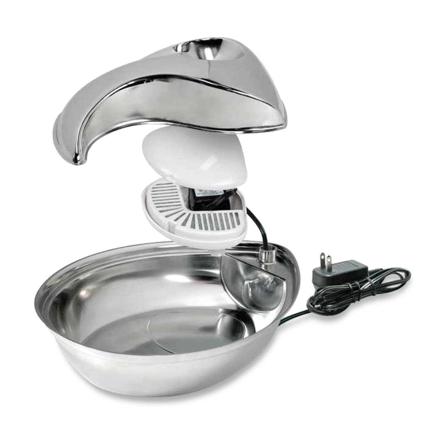 Cats prefer fresh, moving water and are attracted to the sound. Automatic water fountains encourage pets to drink more, improving their health through increased hydration. The elegant shape and sparkling stainless steel complement any décor. Circulating drinking water is naturally appealing to pets Replaceable charcoal filter for clean and pure, healthy water Heavy-duty ceramic – ceramic drinking bowls help prevent feline acne Easy clean and dishwasher safe 60 oz capacity reduces the number of daily refills Modern raindrop shape compliments décor of any room Continuously filters water For optimal performance, clean the fountain once a week, change the filter every two to four weeks, and disassemble/clean the pump once a month. The video below provides step-by-step instructions for cleaning the pump and applies to all fountain styles. [embed]https://www.youtube.com/watch?v=JKquHa-MwQs[/embed]
