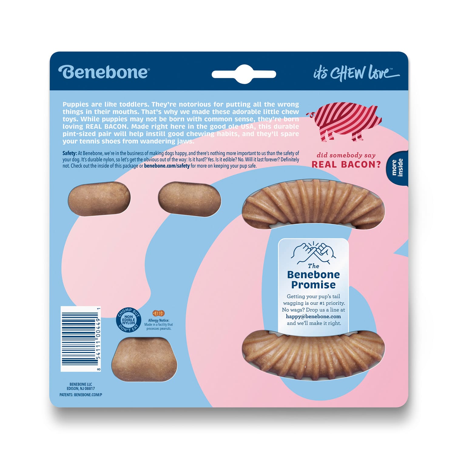 "aligncenter size-full wp-image-85794" src="https://naturallyforpets.com/wp-content/uploads/2021/09/Benebone-puppy-banner.jpg" alt="" width="970" height="600" /> Help sooth your teething puppy with Benebone’s Puppy Pack Bacon Flavor Puppy Chew Toy! Made in the USA with a wag-worthy bacon flavor, these chew toys are designed with a bit of softness that’s gentle on little teeth but still helps satisfy your little one’s chewing desires. Each purchase comes with two toys—a dental chew and a wishbone. The dental chew has ridges along the ends to help scrub away plaque and tartar, while the wishbone offers a fun shape for your pup to chew on. Both toys are designed with your paw-tner in mind, providing him with plenty of places to grip with his paws, so he can fully enjoy his new Benebones. What’s Inside? Nothing but Nylon and Real Bacon for Tantalizing Flavor "a-unordered-list a-vertical a-spacing-mini"> DURABLE, WITH A LITTLE GIVE – Benebones are for determined chewers. Our puppy line is durable and quite firm to the human touch, but is a teeny bit more forgiving for teething pups. REAL BACON! – We use only 100% REAL BACON for flavor. Trust us, puppies can tell the difference. EASY TO PICK UP AND CHEW – Our Wishbone and Dental Chew are curved for a paw-friendly grip so your pup can quickly grab them and get a good chew going. Think about it: puppies don’t have thumbs. USA Made – We make and source everything in the USA. [video width="854" height="480" mp4="https://naturallyforpets.com/wp-content/uploads/2021/09/Benebone-Puppy-2-Pack-Dental-ChewWishbone-Dog-C1.mp4"][/video] "aligncenter size-full wp-image-85118" src="https://naturallyforpets.com/wp-content/uploads/2021/09/benebone-sizing-guide.jpg" alt="benebone sizing guide" width="970" height="300" />[video width="1920" height="1080" mp4="https://naturallyforpets.com/wp-content/uploads/2021/09/benebone.mp4"][/video]