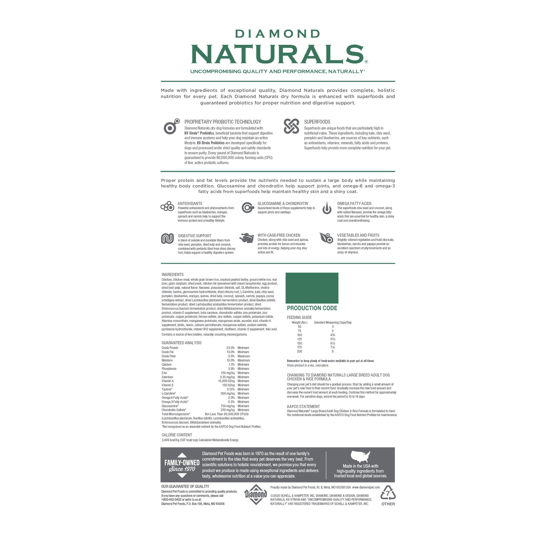 Diamond Naturals Large Breed Adult Dog Chicken & Rice Formula is formulated to meet the nutritional levels established by the AAFCO Dog Food Nutrient Profiles for maintenance.Additional Information