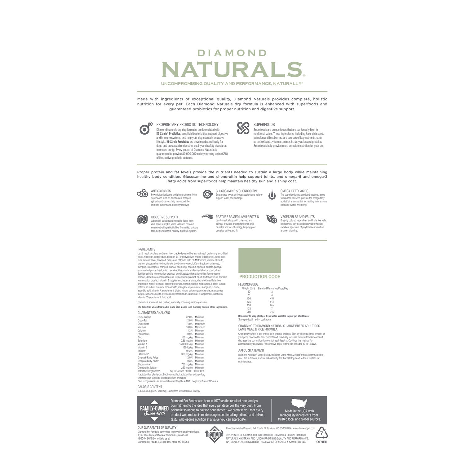 Diamond Naturals Large Breed Adult Dog Lamb Meal & Rice Formula is formulated to meet the nutritional levels established by the AAFCO Dog Food Nutrient Profiles for maintenance.Additional Information