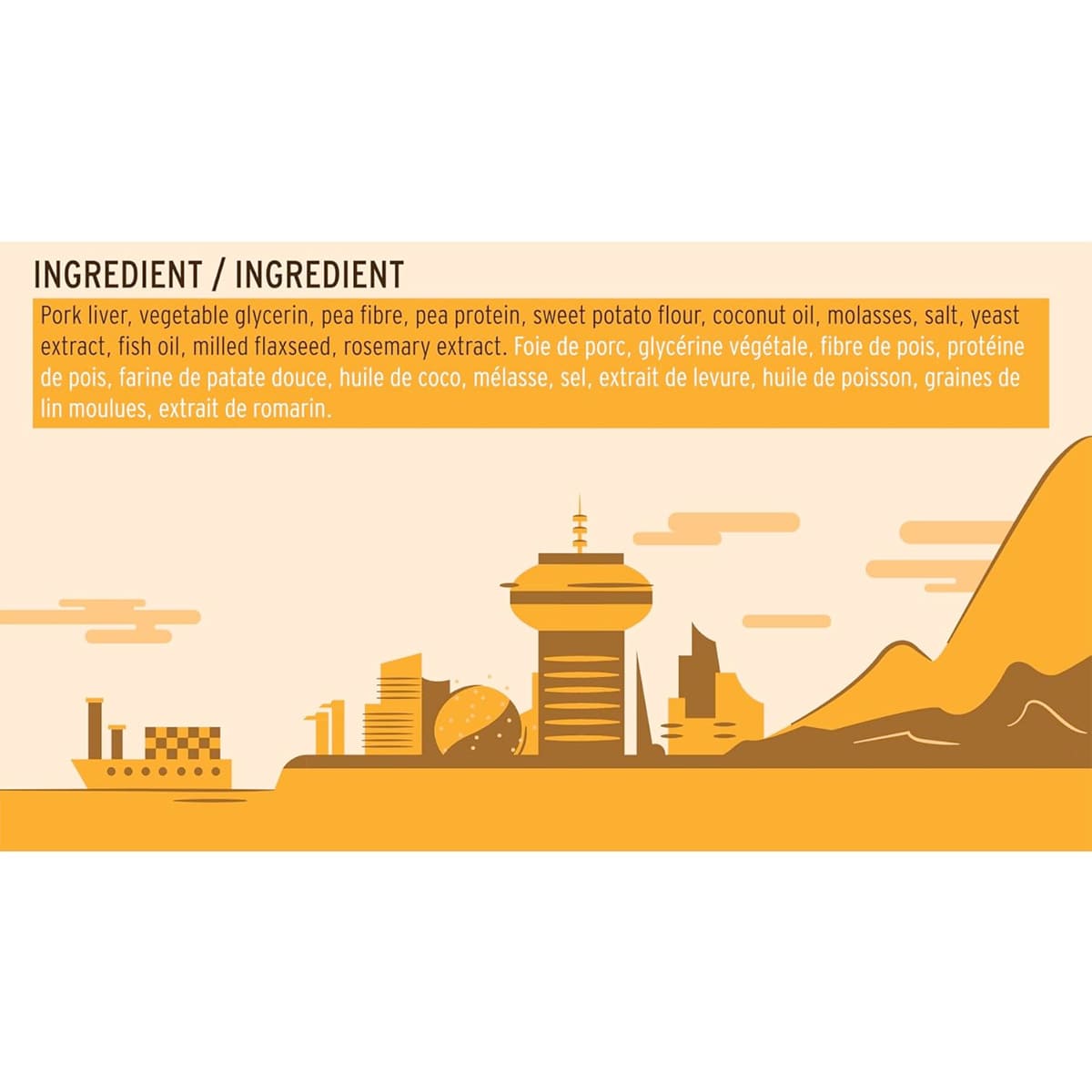 Pork Liver, Vegetable Glycerin, Pea Fibre, Pea Protein, Sweet Potato Flour, Coconut Oil, Molasses, Salt, Yeast Extract, Fish Oil, Milled Flaxseed, Rosemary Extract.Caloric Content