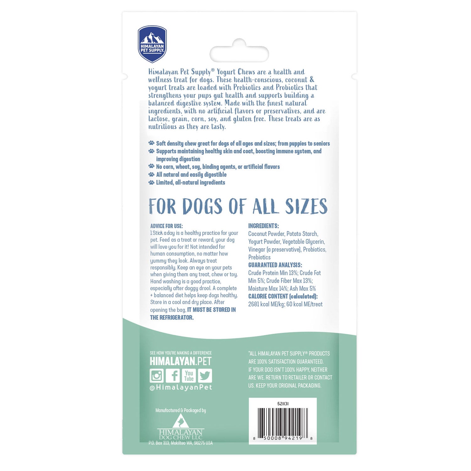Yogurt Sticks® are a health and wellness treat for dogs. These health-conscious coconut & yogurt treats are loaded with Prebiotics and Probiotics that strengthen your pup’s gut health and support building a balanced digestive system. They are made with the finest natural ingredients, no artificial flavors or preservatives, and are lactose, grain, corn, soy, and gluten-free. These treats are as nutritious as they are tasty. Ingredients: Coconut Powder, Potato Starch, Yogurt powder, Vegetable Glycerin, Vinegar (a preservative), Probiotics, Prebiotics Guaranteed Analysis: Crude Protein (Min) 13%; Crude Fat (Min) 5%; Crude Fiber (Max) 13%; Moisture Max (14%); Ash (Max) 5%