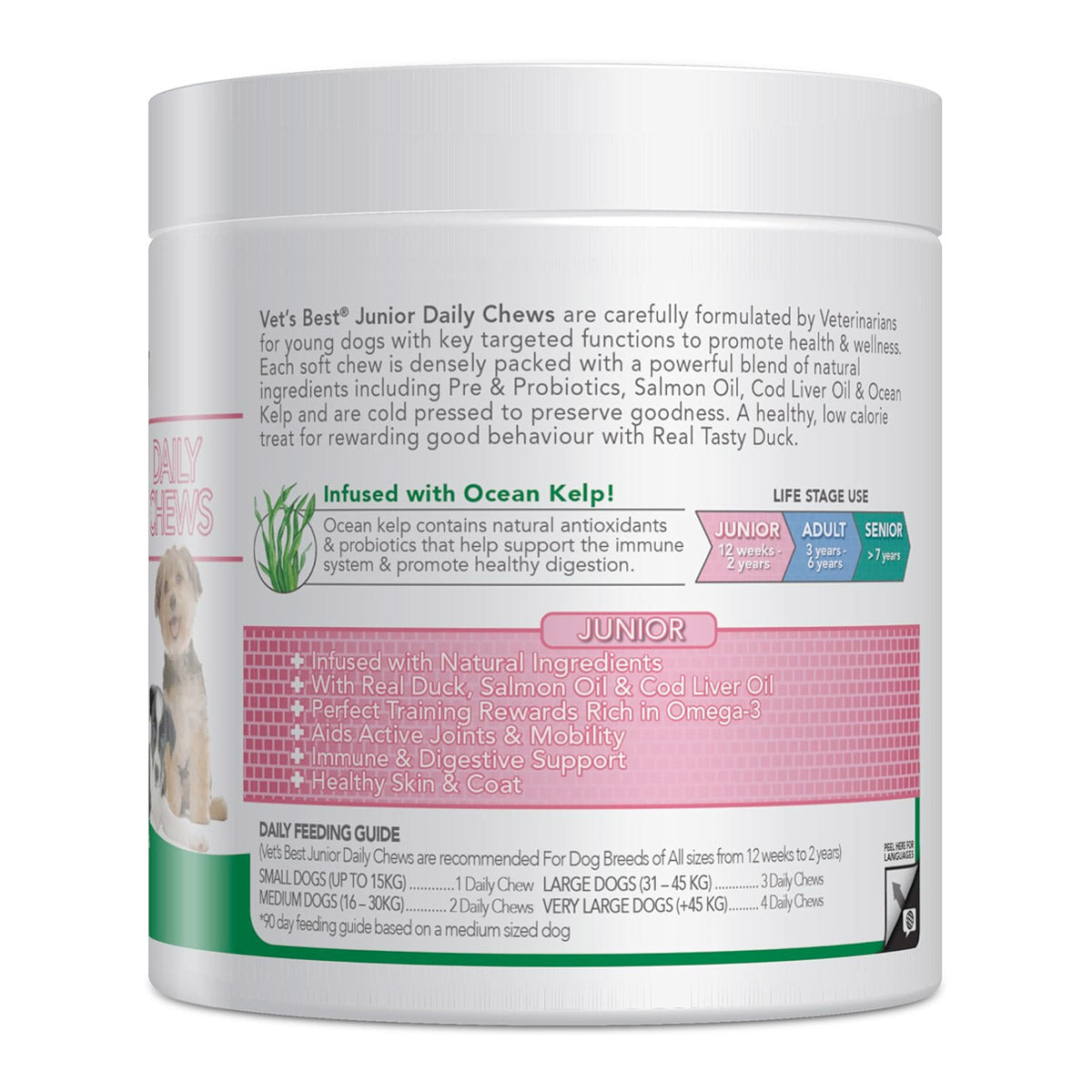 Vet’s Best® Junior Daily Chews are carefully formulated by Veterinarians for young dogs with key targeted functions to promote health & wellness. Each soft chew is densely packed with a powerful blend of natural ingredients including Pre & Probiotics, Salmon Oil, Cod Liver Oil & Ocean Kelp and are cold pressed to preserve goodness. A healthy, low calorie treat for rewarding good behaviour with Real Tasty Duck. Infused with Natural Ingredients Formulated by Veterinarians for young dogs from 12 weeks- 2 years With Real Duck, Salmon & Cod Liver Oils Perfect Training Rewards Rich in Omega-3 Aids Active Joint & Mobility Immune & Digestive Support Supports Healthy Skin & Coat "aligncenter size-full wp-image-133461" src="https://naturallyforpets.com/wp-content/uploads/2024/03/VetsBest-Daily-Soft-Chews-Junior.png" alt="" width="2026" height="824" />