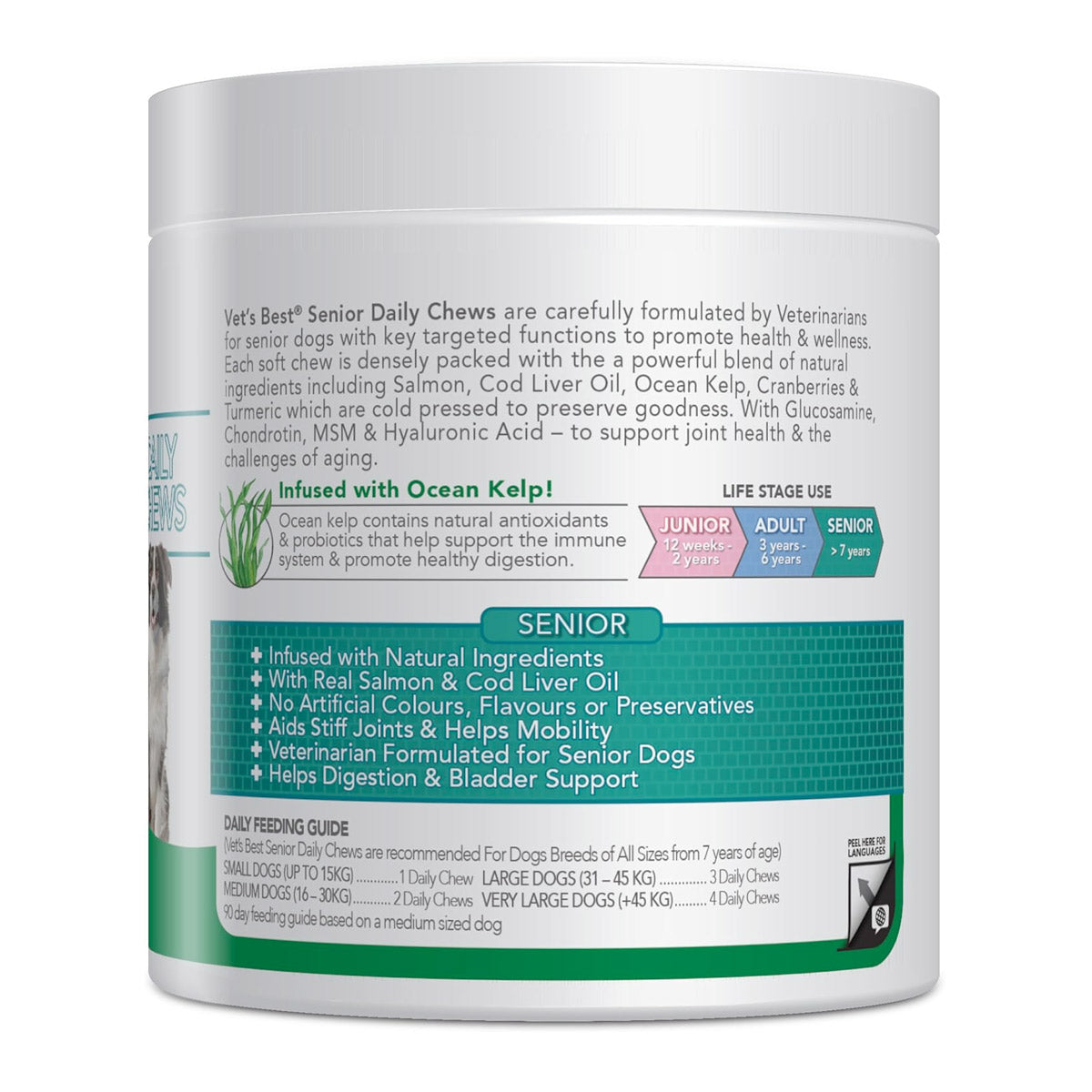 Vet’s Best® Senior Daily Chews are carefully formulated by Veterinarians for senior dogs with key targeted functions to promote health & wellness. Each soft chew is densely packed with a powerful blend of natural ingredients including Salmon, Cod Liver Oil, Ocean Kelp, Cranberries & Turmeric and are cold pressed to preserve goodness. They also contain Glucosamine, Chondrotin, MSM & Hyaluronic Acid to support joint health & the challenges of aging. Infused with Natural Ingredients Veterinarian Formulated for Senior Dogs 7 years and older With Real Salmon, Ocean Kelp & Cod Liver Oil No Artificial Colours, Flavours or Preservatives Aids Stiff Joints & Helps Mobility Helps Digestion & Bladder Support "aligncenter size-full wp-image-133481" src="https://naturallyforpets.com/wp-content/uploads/2024/03/VetsBest-Daily-Soft-Chews-Senior.png" alt="" width="2014" height="928" />