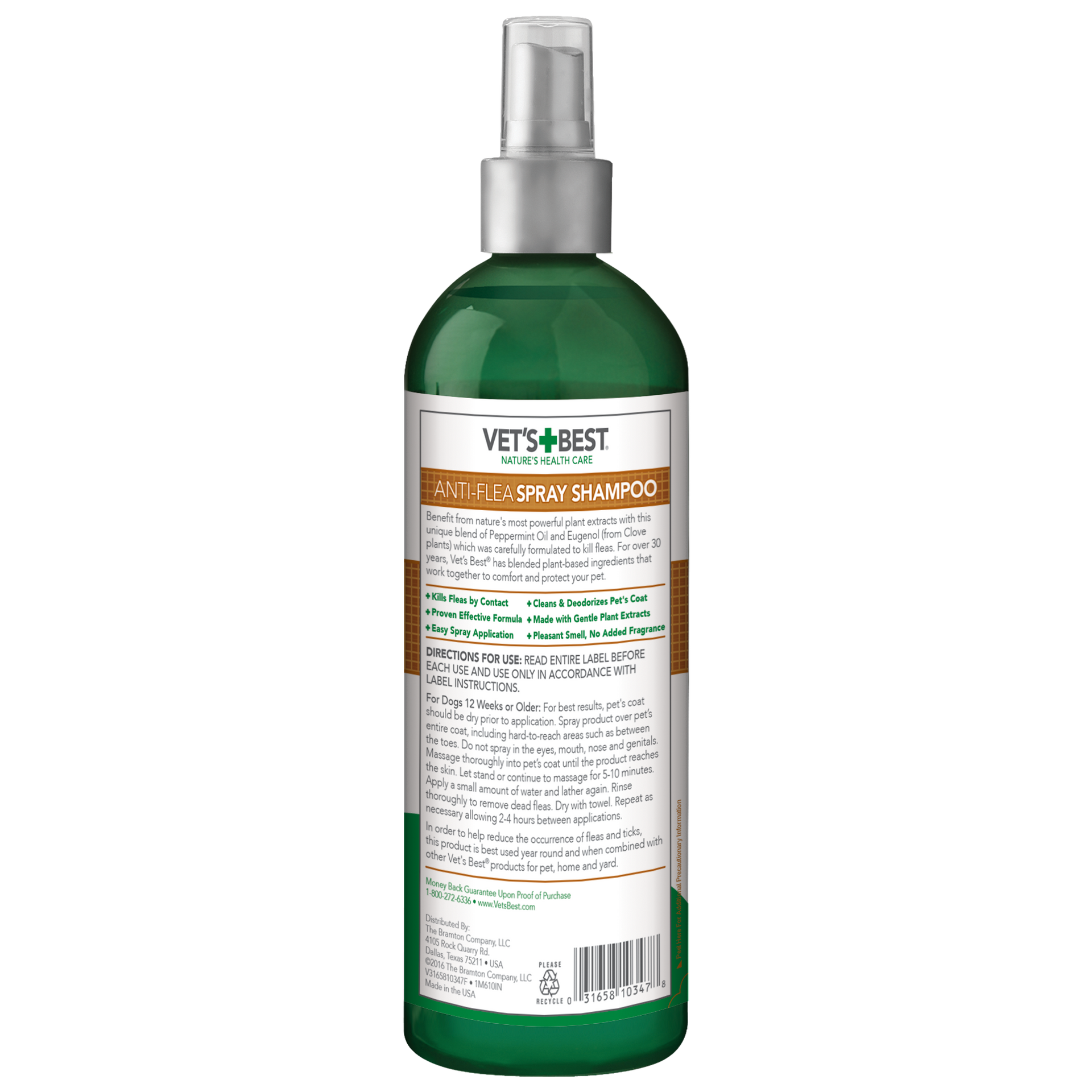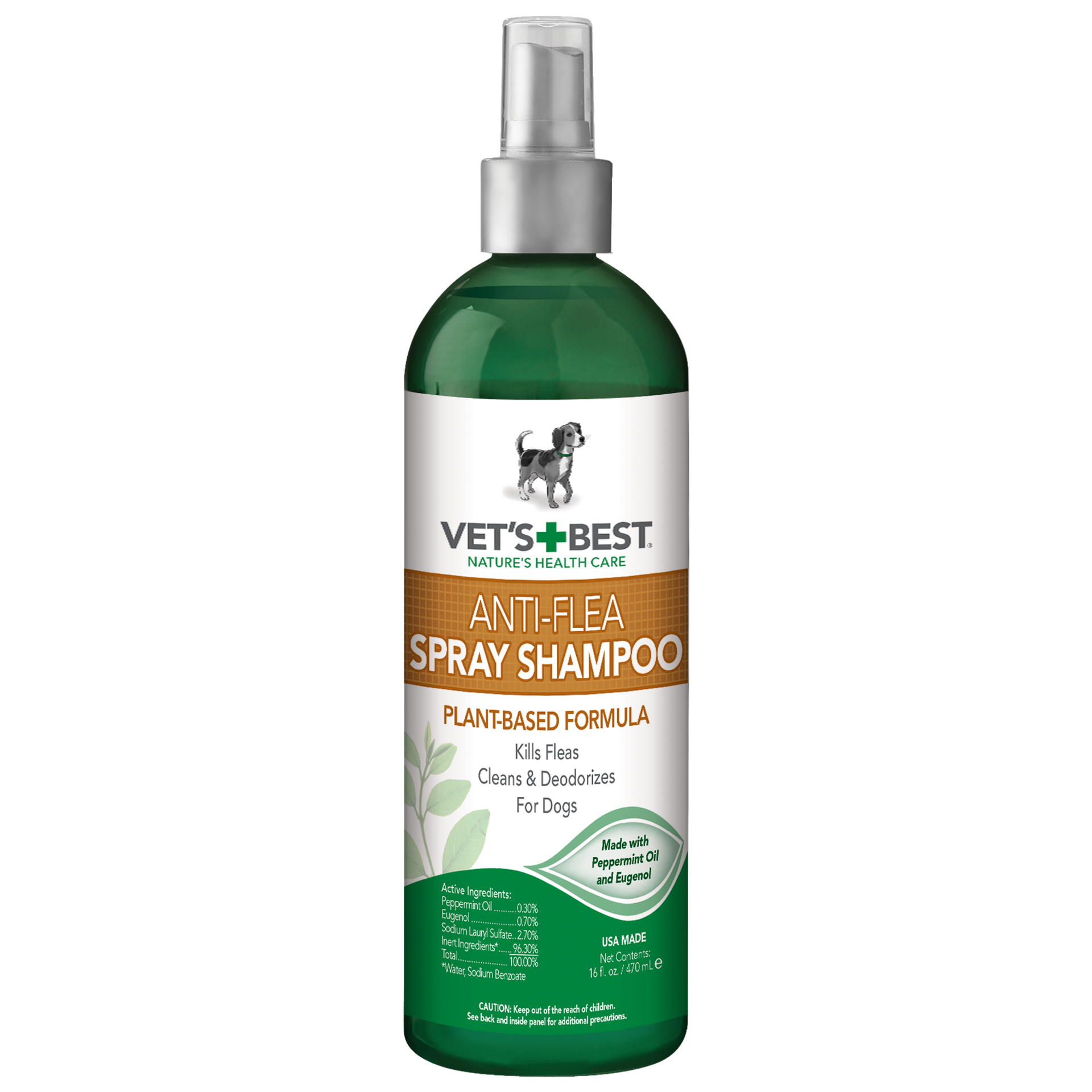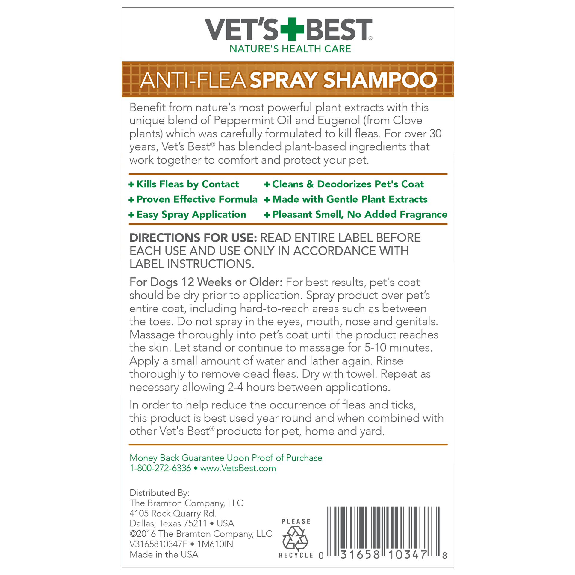 Directions for use: READ ENTIRE LABEL BEFORE EACH USE AND USE ONLY IN ACCORDANCE WITH LABEL INSTRUCTIONS. For Dogs 12 Weeks or Older: For best results, pet’s coat should be dry prior to application. Spray product over pet’s entire coat, including hard-to-reach areas such as between the toes. Do not spray in the eyes, mouth, nose and genitals. Massage thoroughly into pet’s coat until the product reaches the skin. Let stand or continue to massage for 5-10 minutes. Apply a small amount of water and lather again. Rinse thoroughly to remove dead fleas. Dry with towel. Repeat if needed allowing 2-4 hours between applications, not to exceed twice in 24 hours. In order to help reduce the occurrence of fleas and ticks, this product is best used year round and when combined with other Vet’s Best® products for pet, home and yard.Additional Information