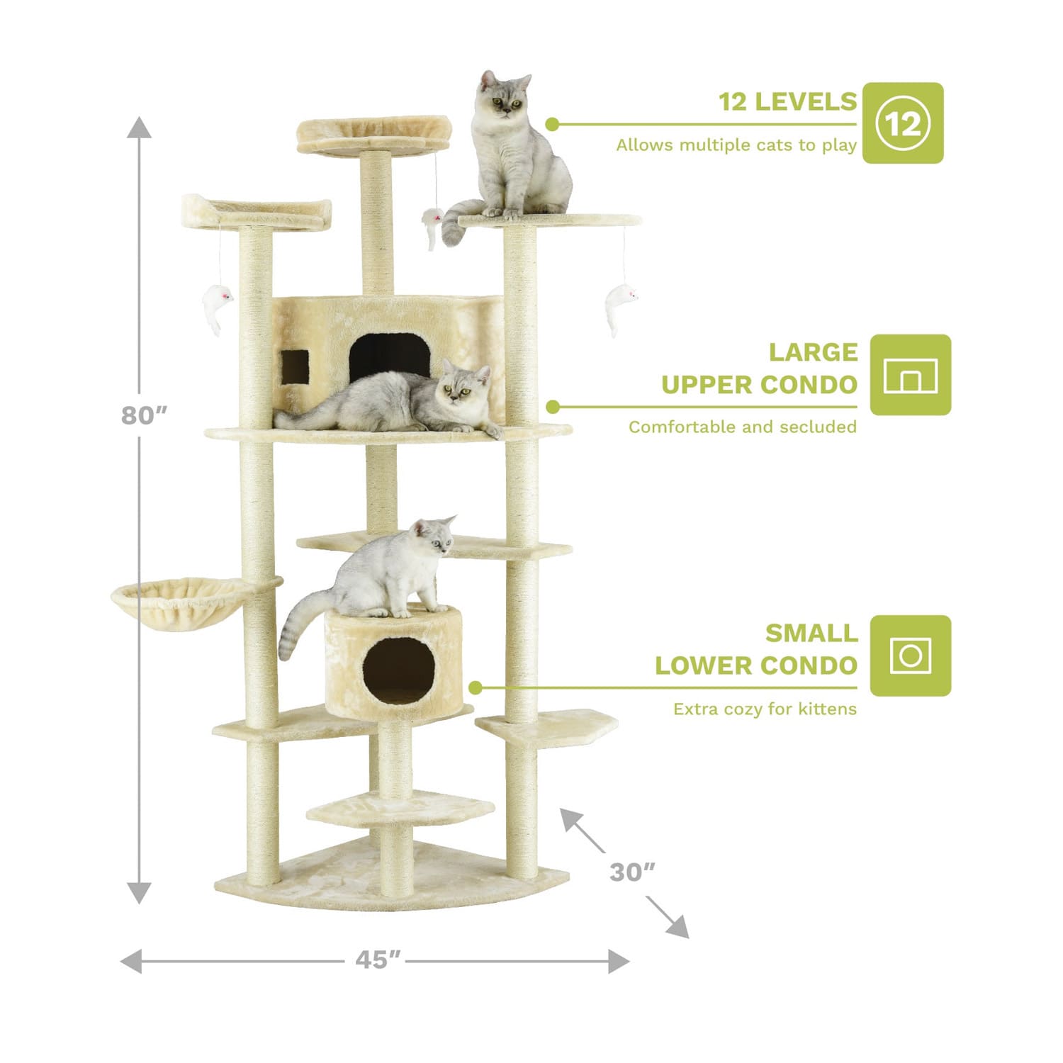 90 Degree Base : Make the most of your space with this innovative, corner-friendly design 12 Levels : Allow multiple cats to play at the same time on this expansive, 12-level cat tree High Perches : Give your cat the best view in the house! Let them survey the scene from multiple elevated perches, perfect for lounging or playing Small Lower Condo : Keep kittens feeling extra cozy in the small lower condo Large Upper Condo : A comfortable space designed to accommodate larger cats Sisal Rope : Facilitate climbing and give Kitty another healthy outlet for his or her urge to scratch Hanging Toys : Encourage cats to climb higher with tantalizing hanging toys, safe for batting, biting and swatting Basket Bed : Your cat will love nothing more than snuggling up in the cozy basket bed for a midday snooze Sisal-wrapped Scratching Posts : Cats can’t wait to sink their claws into this safe and durable, all-natural sisal rope—strong enough to hold up against even the most aggressive scratchersDimensions