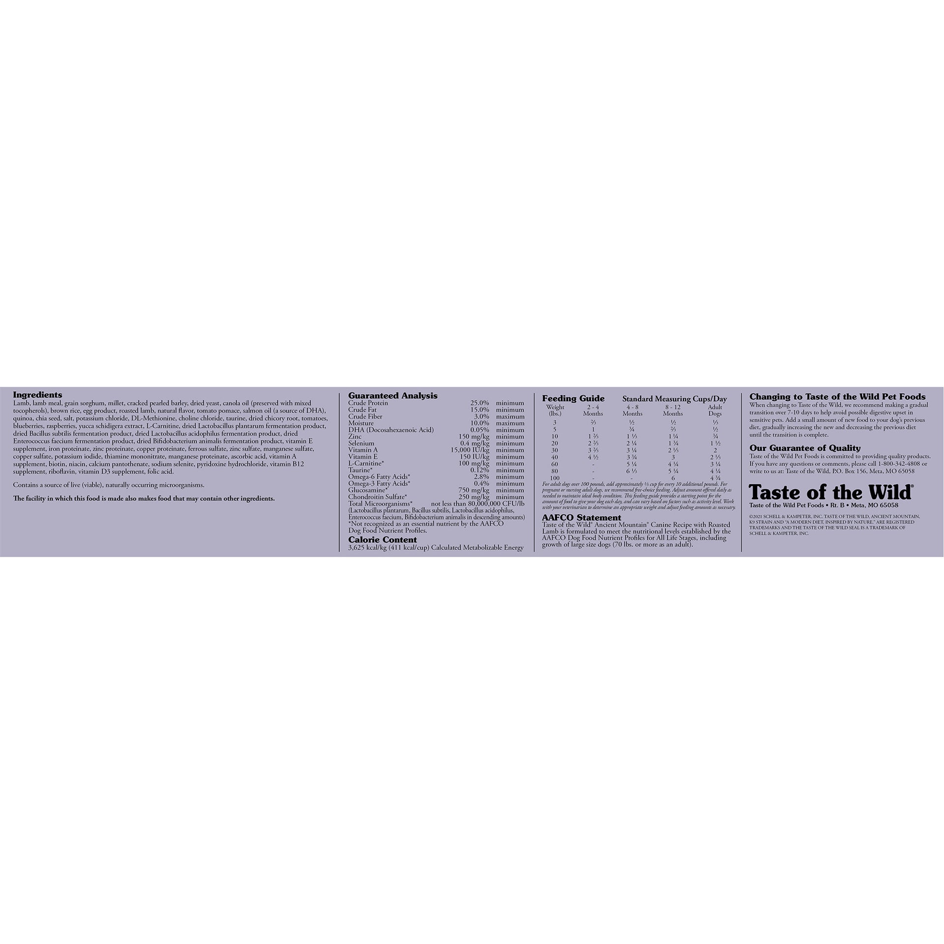 Pasture-raised lamb combines with ancient grains — grain sorghum, millet, quinoa and chia seed — for a tasty and protein-packed diet that’s also rich in fiber, antioxidants, omega fatty acids and more. "aligncenter size-large wp-image-5497" src="https://naturallyforpets.com/wp-content/uploads/2020/02/AM-1-912x1024.png" alt=" Ancient Mountain Canine Recipe" width="640" height="719" /> Ingredients Lamb, lamb meal, grain sorghum, millet, cracked pearled barley, dried yeast, canola oil (preserved with mixed tocopherols), brown rice, egg product, roasted lamb, natural flavor, tomato pomace, salmon oil (a source of DHA), quinoa, chia seed, salt, potassium chloride, DL-Methionine, choline chloride, taurine, dried chicory root, tomatoes, blueberries, raspberries, yucca schidigera extract, L-Carnitine, dried Lactobacillus plantarum fermentation product, dried Bacillus subtilis fermentation product, dried Lactobacillus acidophilus fermentation product, dried Enterococcus faecium fermentation product, dried Bifidobacterium animalis fermentation product, vitamin E supplement, iron proteinate, zinc proteinate, copper proteinate, ferrous sulfate, zinc sulfate, copper sulfate, potassium iodide, thiamine mononitrate, manganese proteinate, manganous oxide, ascorbic acid, vitamin A supplement, biotin, niacin, calcium pantothenate, manganese sulfate, sodium selenite, pyridoxine hydrochloride, vitamin B12 supplement, riboflavin, vitamin D3 supplement, folic acid. Contains a source of live (viable), naturally occurring microorganisms. Guaranteed Analysis "aligncenter size-large wp-image-5498" src="https://naturallyforpets.com/wp-content/uploads/2020/02/AM-G-1-881x1024.png" alt="" width="640" height="744" /> *Not recognized as an essential nutrient by the AAFCO Dog Food Nutrient Profiles. Calorie Content 3,625 kcal/kg (391 kcal/cup) Calculated Metabolizable Energy Feeding Guide "aligncenter size-large wp-image-5499" src="https://naturallyforpets.com/wp-content/uploads/2020/02/AM-F-1-993x1024.png" alt="" width="640" height="660" /> For adult dogs over 100 pounds, add 1/2 cup for every 10 additional pounds. For pregnant or nursing adult dogs, we recommend free-choice feeding. Some dogs may require more or less food than the guidelines depending on activity level and other factors. Changing to Taste of the Wild Pet Foods When changing to Taste of the Wild, we recommend making a gradual transition over 7-10 days to help avoid possible digestive upset in sensitive pets. Add a small amount of new food to your dog’s previous diet, gradually increasing the new and decreasing the previous diet until the transition is complete. AAFCO Taste of the Wild Ancient Mountain Canine Recipe with Roasted Lamb is formulated to meet the nutritional levels established by the AAFCO Dog Food Nutrient Profiles for All Life Stages, including growth of large size dogs (70 lbs. or more as an adult).