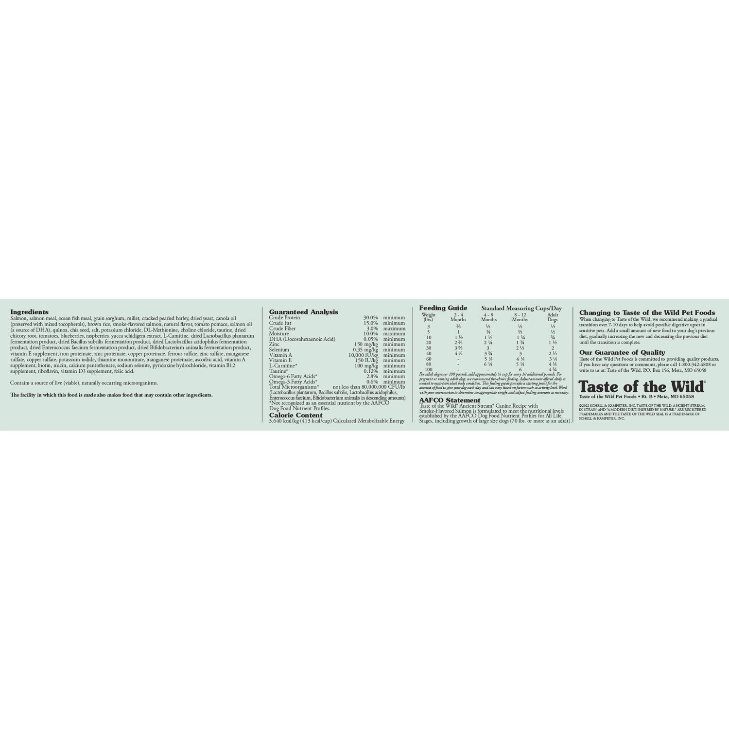Rich in omega fatty acids for healthy skin and a shiny coat, this recipe features sustainably sourced salmon as its number one ingredient as well as nutrient-dense ancient grains. "aligncenter size-large wp-image-5470" src="https://naturallyforpets.com/wp-content/uploads/2020/02/AS-1-915x1024.png" alt="Ancient Stream Canine Recipe" width="640" height="716" /> Ingredients Salmon, salmon meal, ocean fish meal, grain sorghum, millet, cracked pearled barley, dried yeast, canola oil (preserved with mixed tocopherols), brown rice, smoked salmon, natural flavor, tomato pomace, salmon oil (a source of DHA), quinoa, chia seed, salt, potassium chloride, DL-Methionine, choline chloride, taurine, dried chicory root, tomatoes, blueberries, raspberries, yucca schidigera extract, L-Carnitine, dried Lactobacillus plantarum fermentation product, dried Bacillus subtilis fermentation product, dried Lactobacillus acidophilus fermentation product, dried Enterococcus faecium fermentation product, dried Bifidobacterium animalis fermentation product, vitamin E supplement, iron proteinate, zinc proteinate, copper proteinate, ferrous sulfate, zinc sulfate, copper sulfate, potassium iodide, thiamine mononitrate, manganese proteinate, manganous oxide, ascorbic acid, vitamin A supplement, biotin, niacin, calcium pantothenate, manganese sulfate, sodium selenite, pyridoxine hydrochloride, vitamin B12 supplement, riboflavin, vitamin D3 supplement, folic acid. Contains a source of live (viable), naturally occurring microorganisms. Guaranteed Analysis "aligncenter size-large wp-image-5471" src="https://naturallyforpets.com/wp-content/uploads/2020/02/AS-G-1-1024x1007.png" alt="" width="640" height="629" /> Calorie Content 3,640 kcal/kg (392 kcal/cup) Calculated Metabolizable Energy Feeding Guide "aligncenter size-large wp-image-5472" src="https://naturallyforpets.com/wp-content/uploads/2020/02/AS-F-1-990x1024.png" alt="" width="640" height="662" /> AAFCO Taste of the Wild Ancient Stream Canine Recipe with Smoked Salmon is formulated to meet the nutritional levels established by the AAFCO Dog Food Nutrient Profiles for All Life Stages, including growth of large size dogs (70 lbs. or more as an adult).