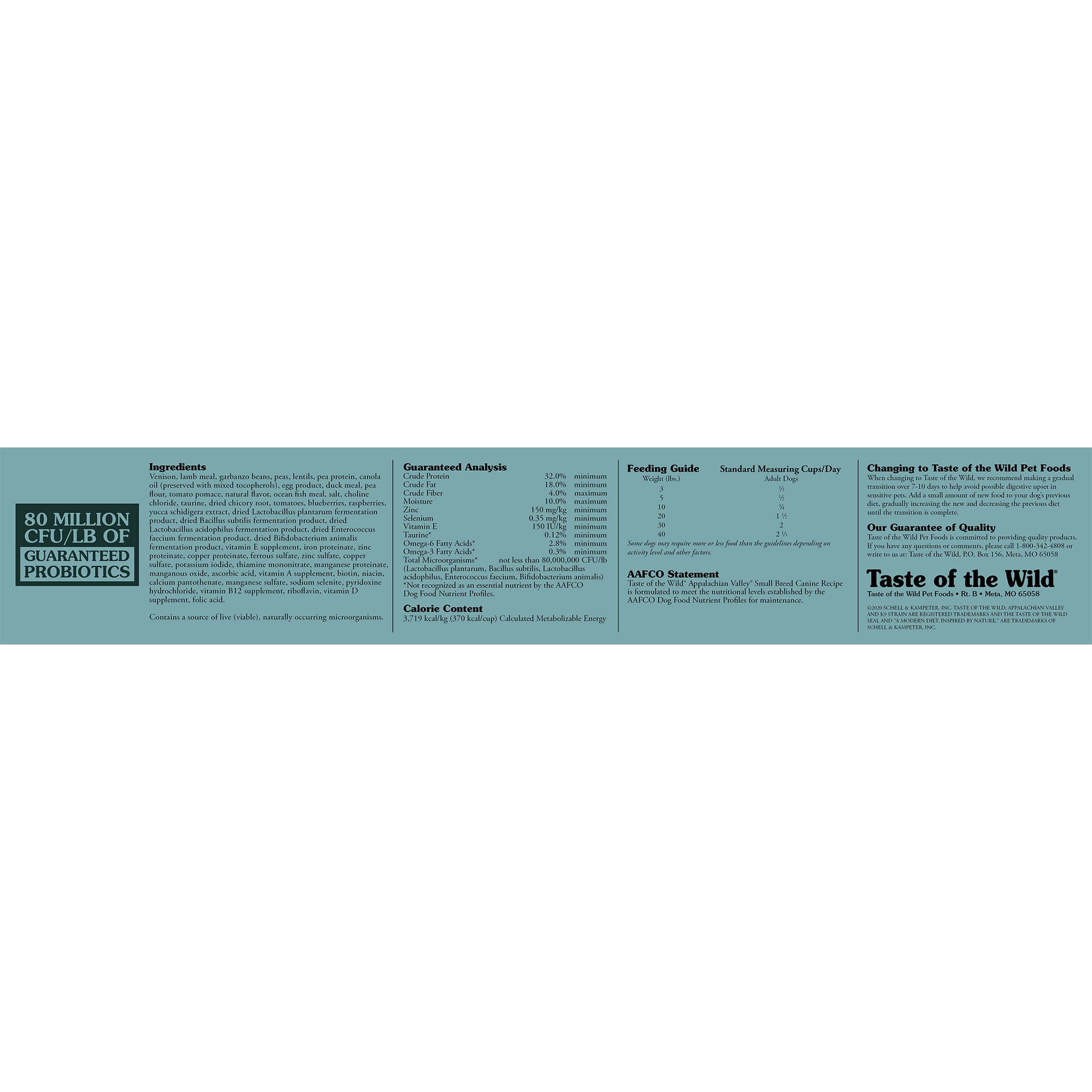 "product-info-section-content drawer-content"> "feeding-guide-wrapper"> Taste of the Wild Appalachian Valley Small Breed Canine Recipe is formulated to meet the nutritional levels established by the AAFCO Dog Food Nutrient Profiles for maintenance.Additional Information