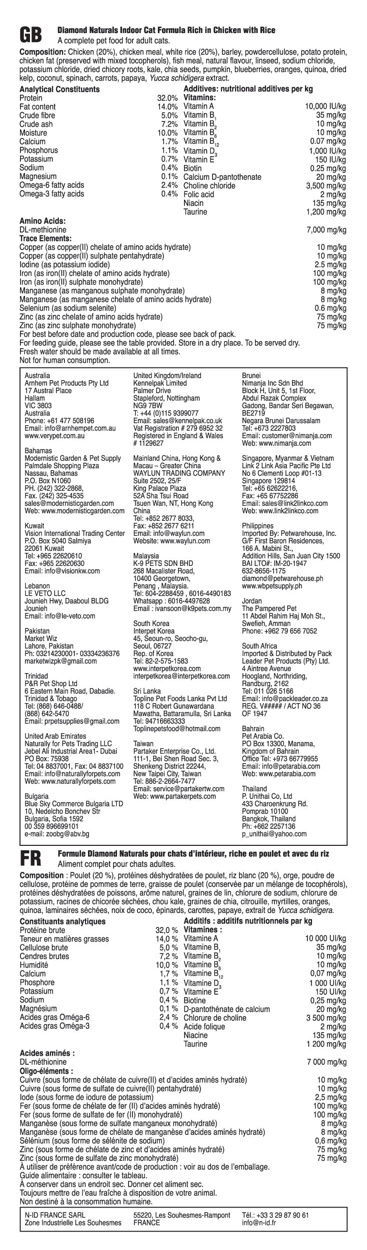 Diamond Naturals Indoor Cat Chicken & Rice Formula is formulated to meet the nutritional levels established by the AAFCO Cat Food Nutrient Profiles for maintenance.Additional Information