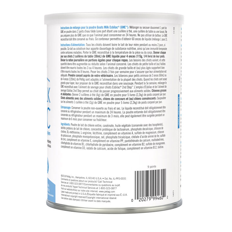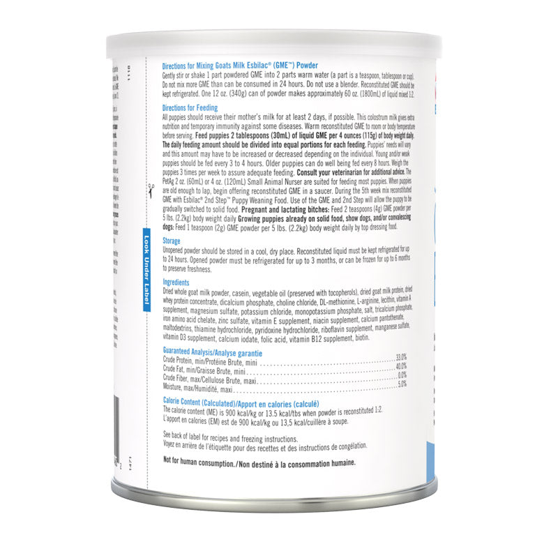 Milk formula for puppies newborn to six weeks with sensitive digestive systems. Recommended as a food source for orphaned or rejected puppies or those nursing, but needing supplemental feeding. Also recommended for growing puppies or adult dogs that are stressed and require a source of highly digestible nutrients. Formulated to provide a caloric pattern similar to bitch’s milk in protein, fat and carbohydrates. Supplies necessary vitamins and minerals to ensure proper development and growth. Easy to digest, highly palatable, easy to mix formula. Ideal supplement for post-surgery and convalescence. Directions for Mixing: Gently shake or stir one part powdered GME into two parts of warm water (A part is a teaspoon, tablespoon or cup.) Do not mix more GME than can be consumed in 24 hours. Do not use a blender. Reconstituted GME should be refrigerated. Directions for Feeding:All puppies should receive their mother’s milk for at least 2 days, if possible. The colostrum milk gives extra nutrition and temporary immunity against some diseases. Warm reconstituted GME to room or body temperature before serving. Feed puppies 2 tablespoons (30mL) of liquid GME per 4 ounces (115g) of body weight. The daily feeding rate should be divided into equal portions for each feeding. Puppies’ needs will vary and this amount may have to be increased or decreased, depending on the individual. Young and/or weak puppies may need to be fed reconstituted GME every 3 or 4 hours. Older puppies do well when fed reconstituted GME every 8 hours. Weigh the puppy daily to assure adequate feeding. Consult your veterinarian for additional advice. The PetAg 2 oz. (60mL) or 4 oz. (120mL) Small Animal Nurser is suited for feeding most puppies. When puppies are old enough to lap, begin offering reconstituted GME in a saucer. During the 6th week mix reconstituted GME with Esbilac®2nd Step Puppy Weaning Food. Use of GME and 2nd Step will allow the puppy to be gradually switched to solid food.Pregnant and lactating bitches:Feed 2 teaspoons (4g) GME powder per 5 lbs. (2.2kg) body weight daily.Growing puppies already on solid food, show dogs and/or convalescing dogs:Feed 1 teaspoon (2g) GME powder per 5 lbs. (2.2kg) body weight daily by top dressing food. Storage:Unopened powder should be stored in a cool dry place. Reconstituted GME must be kept refrigerated for up to 24 hours. Opened powder can be refrigerated for up to 3 months, or can be frozen for up to 6 months to preserve freshness. Ingredients: Dried whole goat milk powder, casein, soybean oil, dried goat milk protein, dried whey protein concentrate, dicalcium phosphate, choline chloride, DL-methionine, L-arginine, lecithin, mixed tocopherols (preservative), vitamin A supplement, magnesium sulfate, potassium chloride, monopotassium phosphate, salt, tricalcium phosphate, carrageenan, dipotassium phosphate, iron proteinate, zinc sulfate, vitamin E supplement, niacin supplement, calcium pantothenate,copper proteinate, maltodextrins, thiamine hydrochloride, pyridoxine hydrochloride, riboflavin supplement, manganese sulfate, vitamin D3 supplement, calcium iodate, folic acid, vitamin B12 supplement, biotin. Guaranteed Analysis Crude Protein, min................................. 33.0% Crude Fat, min....................................... 40.0% Crude Fiber, max..................................... 0.0% Moisture, max.......................................... 5.0% The calorie content (ME) is 900 kcal/kg or 13.5 kcal/Tbs. when the powder is reconstituted 1:2 This product is intended for intermittent or supplemental feeding only.Not for human consumption