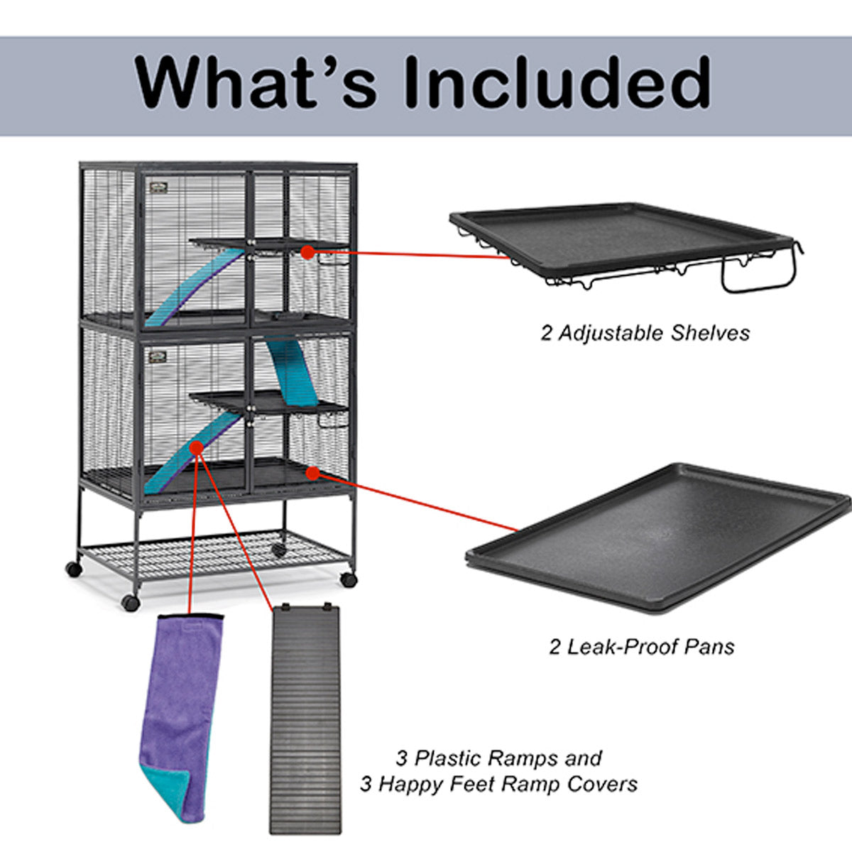 Based on the design of the popular Ferret Nation® habitat, the Critter Nation® small animal habitat features doors that open fully, critter-proof door latches, large adjustable leak-proof shelves with anchor points for toys or bedding, wire ramps with Happy Feet Ramp Covers, and sturdy, leak-proof, removable plastic pans for easy cleaning. Small animal clubs and individual owners around the world use Critter Nation® habitats to house their pet rats, chinchillas, sugar gliders, hedgehogs, degus, and more. Give your small animal a happy home with Critter Nation®, the World’s Best Small Animal Habitat.