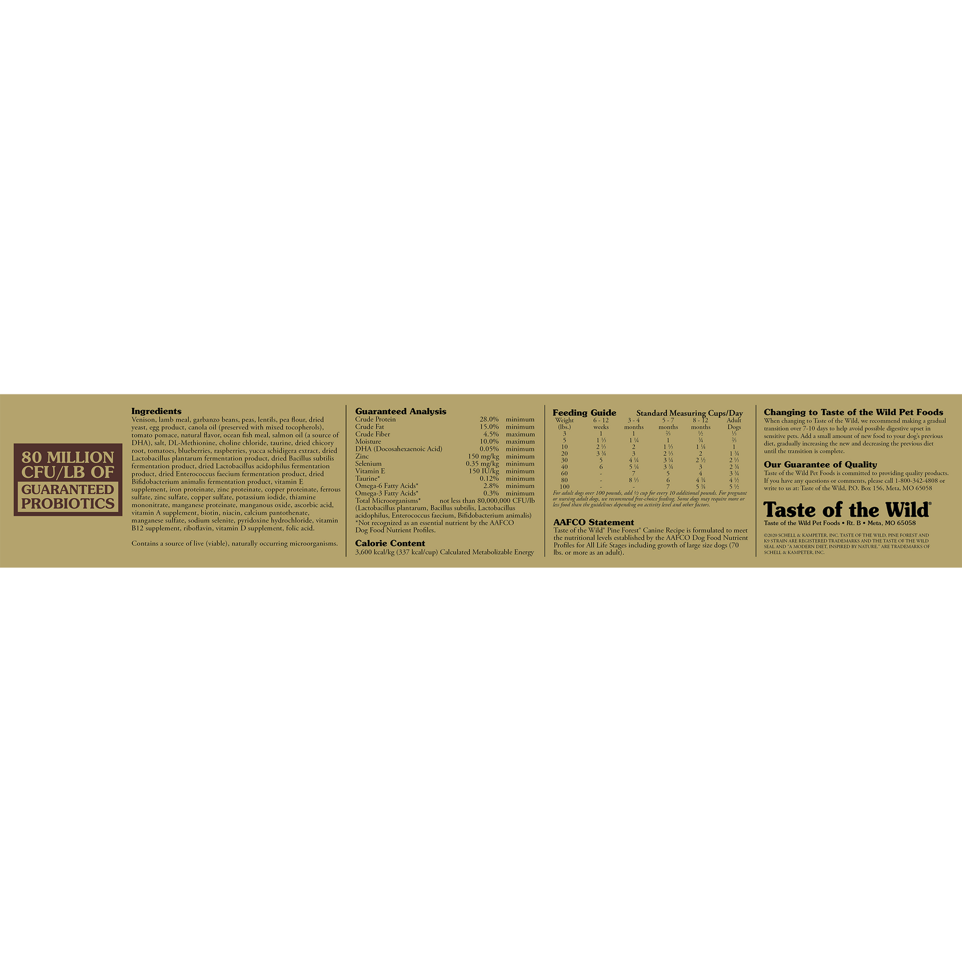 Taste of the Wild Pine Forest Canine Recipe is formulated to meet the nutritional levels established by the AAFCO Dog Food Nutrient Profiles for All Life Stages including growth of large size dogs (70 lbs. or more as an adult).Additional Information