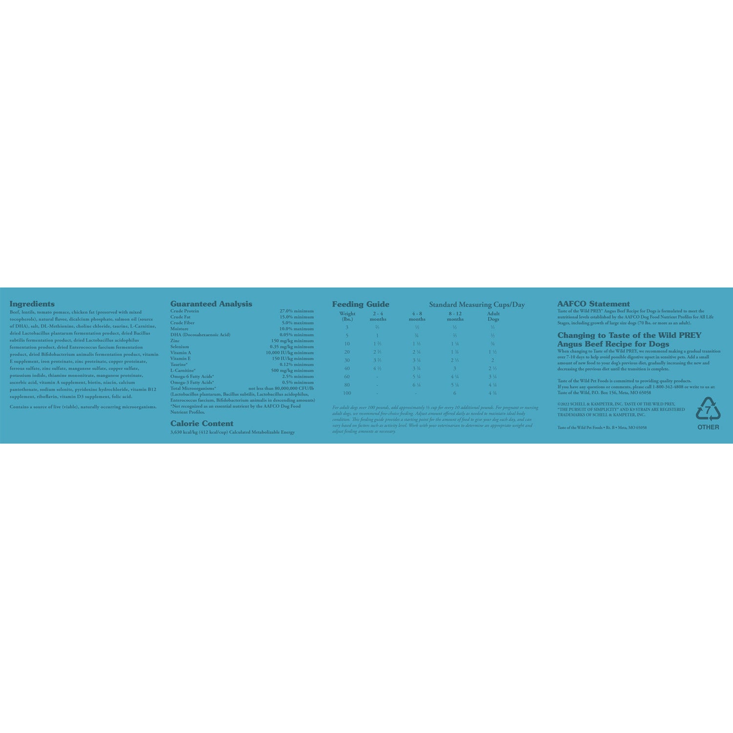 Taste of the Wild PREY Angus Beef Formula for Dogs is formulated to meet the nutritional levels established by the AAFCO Dog Food Nutrient Profiles for All Life Stages, including growth of large size dogs (70 lbs. or more as an adult).Additional Information