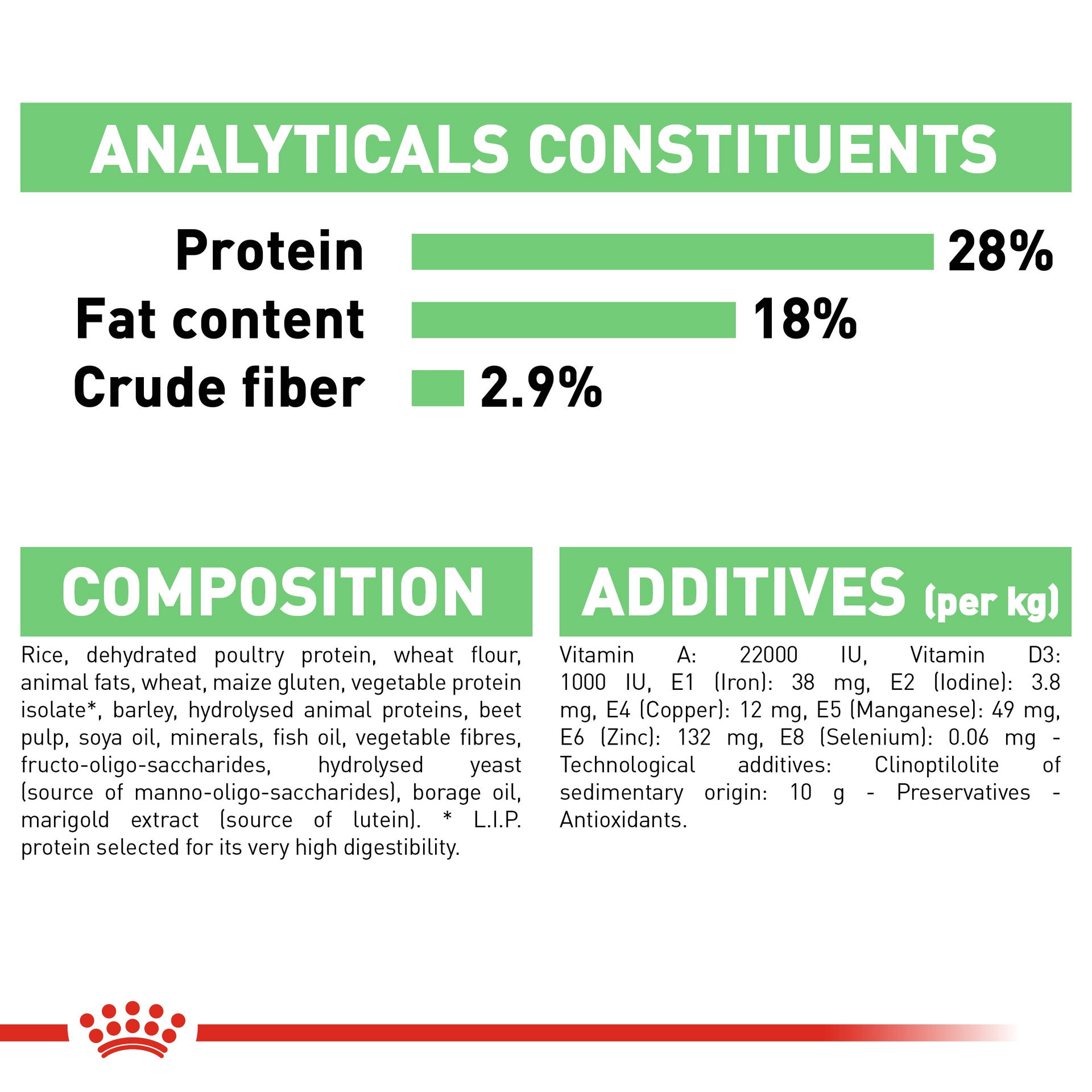 ROYAL CANIN Maxi Digestive Care ADULT DOG DRY food. For dogs prone to digestive discomfort, tailored nutrients including proteins, essential fats, vitamins, and minerals help to support a healthy gut, as well as your dogs lifelong wellbeing. Suitable for dogs that weigh from 26kg to 44kg. ROYAL CANIN Digestive Care Maxi is specially crafted for dogs prone to digestive sensitivity. Because larger dogs like yours are more prone to fermentation in the gut, soft stools can often be a problem. Complete feed for dogs - For adult and mature large breed dogs (from 26 to 44 kg) - Over 15 months old - Dogs prone to digestive sensitivity. Composition: dehydrated poultry protein, rice, wheat flour, animal fats, vegetable protein isolate*, wheat, hydrolysed animal proteins, barley, maize gluten, vegetable fibres, beet pulp, fish oil, soya oil, minerals, psyllium husks and seeds, borage oil, marigold extract (source of lutein), hydrolysed crustaceans (source of glucosamine), hydrolysed cartilage (source of chondroitin). Additives (per kg): Nutritional additives: Vitamin A: 19000 IU, Vitamin D3: 800 IU, E1 (Iron): 38 mg, E2 (Iodine): 3.8 mg, E4 (Copper): 12 mg, E5 (Manganese): 50 mg, E6 (Zinc): 133 mg, E8 (Selenium): 0.06 mg - Technological additives: Clinoptilolite of sedimentary origin: 10 g - Preservatives - Antioxidants Analytical constituants: Protein: 28.0% - Fat content: 18.0% - Crude ash: 6.0% - Crude fibres: 2.9%.