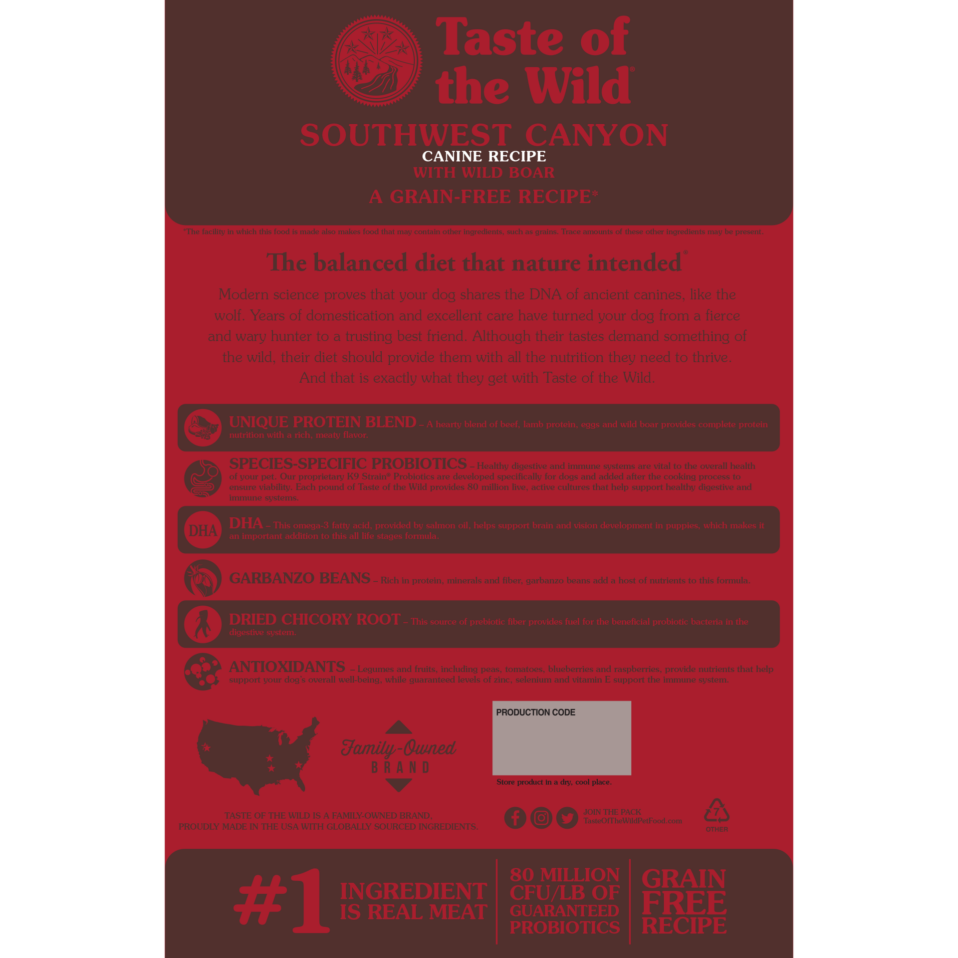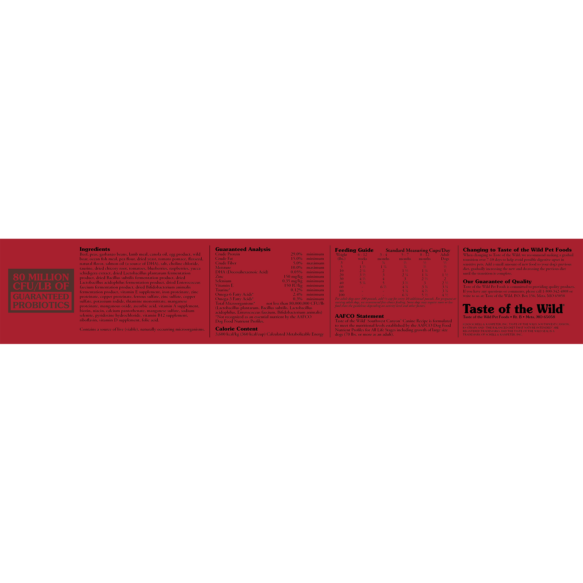 Taste of the Wild Southwest Canyon Canine Recipe is formulated to meet the nutritional levels established by the AAFCO Dog Food Nutrient Profiles for All Life Stages including growth of large size dogs (70 lbs. or more as an adult).Additional Information